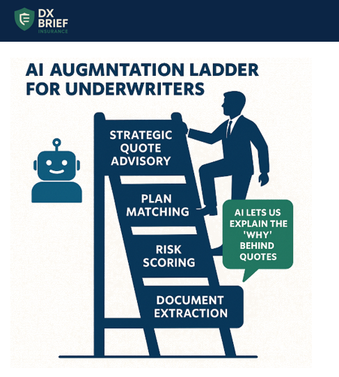 Underwriters are evolving from processors to strategic advisors. AI handles risk scoring, plan matching, and data extraction, freeing underwriters to explain the "why" behind quotes.